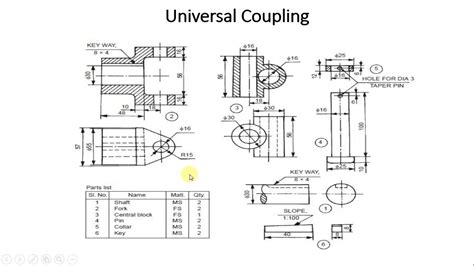 Here we are providing drafting of universal joint parts.all drafting parts also available in pdf format.you can practice these exercises in cad tool. A universal coupling is a special type of coupling in which misalignment of shafts is allowed. It is commonly known for its application in automobiles and trucks. A universal joint is a positive, mechanical connection used to.